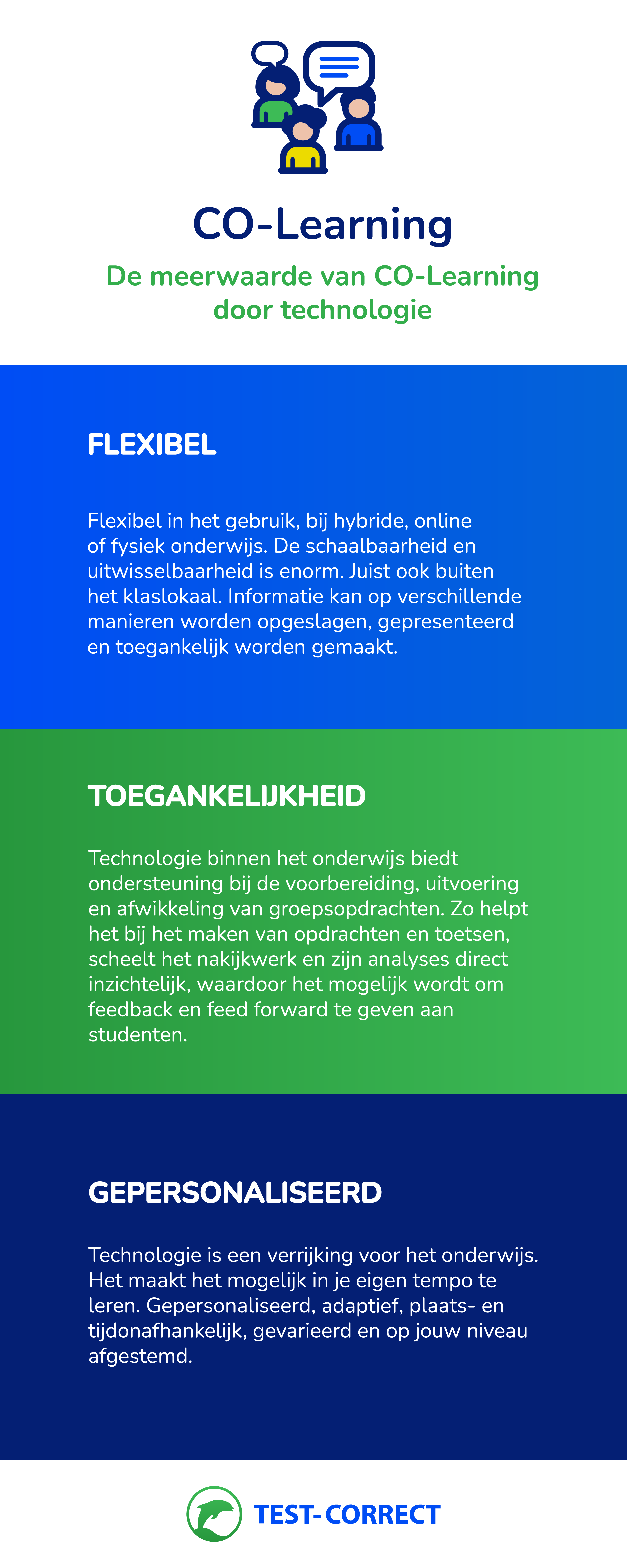 Er is meer mogelijk met technologie en dat maakt de inzet van CO-Learning steeds toegankelijker. Met name omdat de toeleverende industrie, zoals uitgeverijen en leveranciers van toetsplatformen, in de ontwikkeling van haar producten hier rekening mee houdt. Belangrijkste genoemde reden is dat technologie ondersteuning biedt bij de voorbereiding, uitvoering en afwikkeling van groepsopdrachten. Ook het werk achteraf wordt genoemd. De analyse van verkregen data en de mogelijkheid om feedback en feed forward te geven aan de leerlingen en studenten.